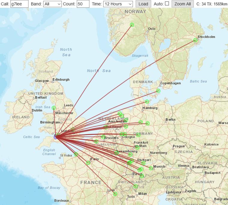 I tested this on 12W SSB with RAF Hack Green. I was received at 57 at Hack Green. The highest power the spiral will take with my variable capacitor of a little over 1mm plate separation is 75W before it arcs. Hack Green is 136 miles away and definitely not line of sight so propagation is most likely NVIS. I was also received 110 miles away at Wheathampstead north of London and 155 miles away at Conwy in North Wales but I failed to be heard in Scotland. These tests were done in the middle of the day, 10:30 UTC to hackgreen and the others were done 14:40 UTC, so definitely daytime propagation typical of WAB.