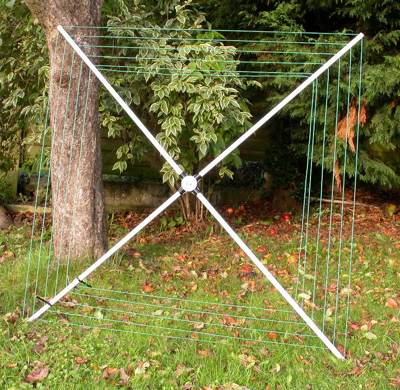 80m spiral frame antenna. This is a transformer loop design, the coax is connected to the triangular inner loop you can see in the top and right side - the third part of the triangle runs inside the plastic conduit and is terminated in the middle on the BNC in the round centre 4-way box