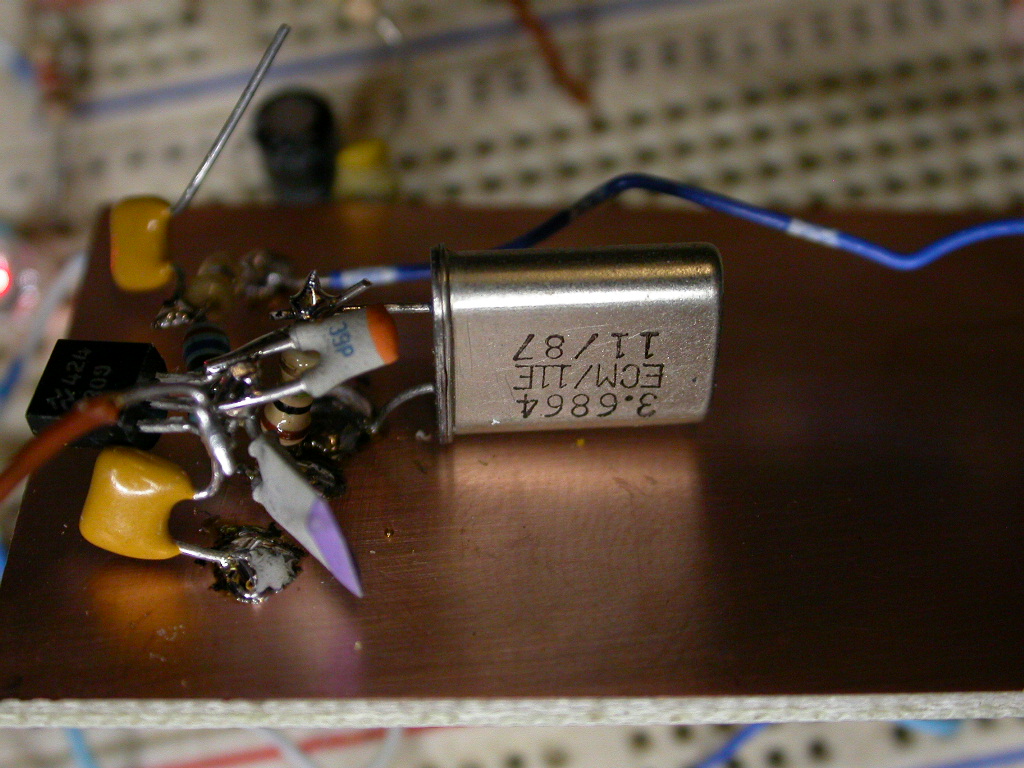 Frequency display 3.686289MHz so about 150Hz off. I haven’t made any attempt to tune the crystal with a capacitor padded across it.