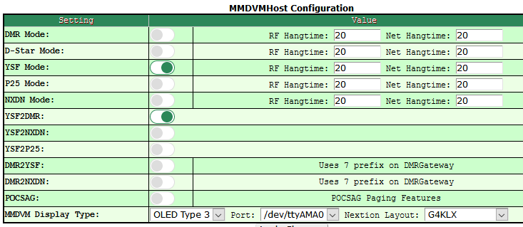 Go to Config. Enable YSF (Yaesu System Fusion) because that’s what your radio puts out. And enable YSF2DMR, which takes your DV signal from YSF and encapsulates it into DMR, according to the panel further down the line. Hit Apply changes, which should simplify the configuration panel by turning off all the extraneous guff you won’t use.
