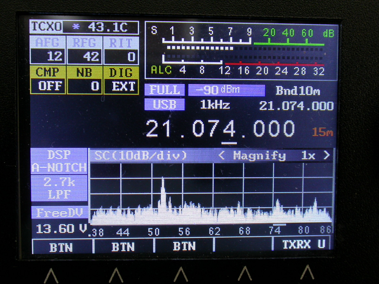 If your HS1 says anything else than perhaps the quirks are either fixed, or at least different. I tested with a Raspberry Pi 4 running Raspbian Buster, running FLdigi and FLrig, and WSJT-X. Both of these work OK with my FT897 and a G4ZLP interface, but the HS1 needs neither - you can use the mini USB connector on the side. If you want to use the USB audio input, then look at the picture above. That says MIC in the little group of boxes on the top left. You ain’t going nowhere with that. You want it to look like below. Diddle with button M3 (confusingly marked RIT) until you get EXT to appear, and correspondingly diddle with M1 to make CMP say OFF. RIT and NB also want to be 0.