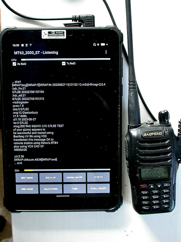Audio signal levels are quite critical using the direct audio cable method, I needed to run my Baeofeng UV-B6 with the volume control almost flat out, whereas the Retevis RT84, which is quite low-end but has a prodigiously loud audio output had to be racked hack to audio output 2 (out of the limted 8 steps) to be decoded right. You may find an audio recorder app on the tablet that shows the waveform useful to line the signal up. The other way I used a RSP-1A to monitor the RF and AF signal from the transceiver. I was a little bit short of grunt from the tablet to the rig, hence the use of both audio channels into the mic input, even then I had to set the media audio up towards the maximum, when the Android nanny warning of don’t listen to music too loud came up.