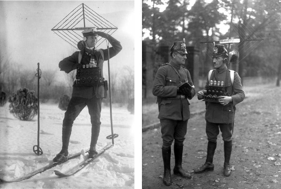Ski patrol with portable transceiver (1924) and Berlin ‘Schutzpolizei’ (1932) using an EA985 receiver. How they didn’t take people’s eyes out with that rig behind them beats me