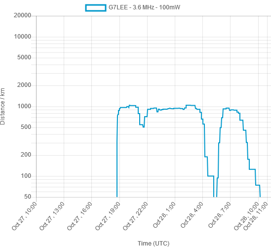 Sotabeams DXplorer DX10 result. I cut over from the 80m skyloop to the spiral at 19.22Z on the 27th (very early on in this trace), oriented in a horizontal plane about 2m from the ground