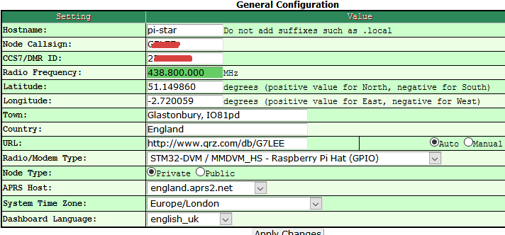 and go enter YOUR callsign and YOUR DMR ID where the red splodges are, then Apply changes
