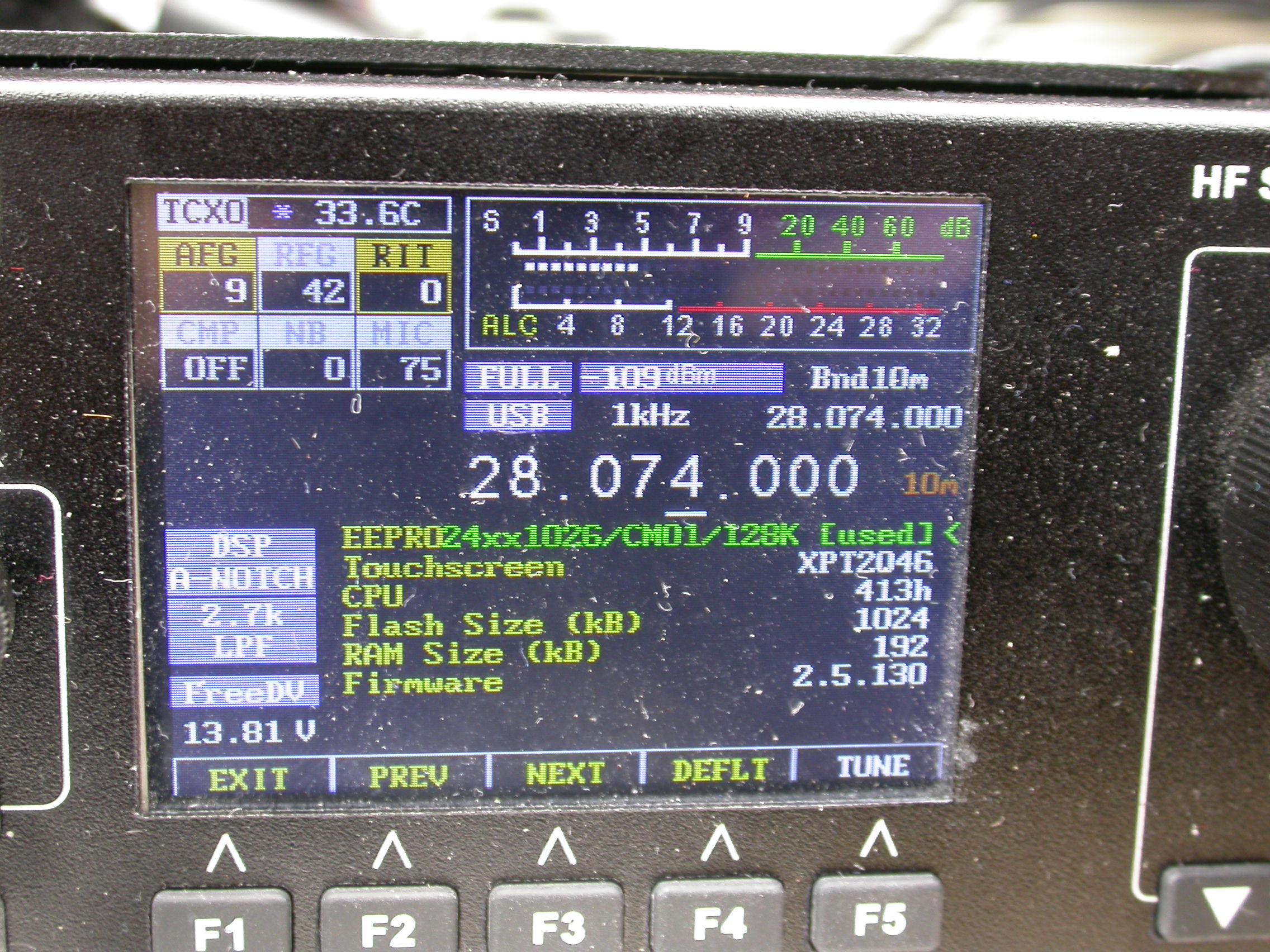 If your HS1 says anything else than perhaps the quirks are either fixed, or at least different. I tested with a Raspberry Pi 4 running Raspbian Buster, running FLdigi and FLrig, and WSJT-X. Both of these work OK with my FT897 and a G4ZLP interface, but the HS1 needs neither - you can use the mini USB connector on the side. If you want to use the USB audio input, then look at the picture above. That says MIC in the little group of boxes on the top left. You ain’t going nowhere with that. You want it to look like below. Diddle with button M3 (confusingly marked RIT) until you get EXT to appear, and correspondingly diddle with M1 to make CMP say OFF. RIT and NB also want to be 0.
