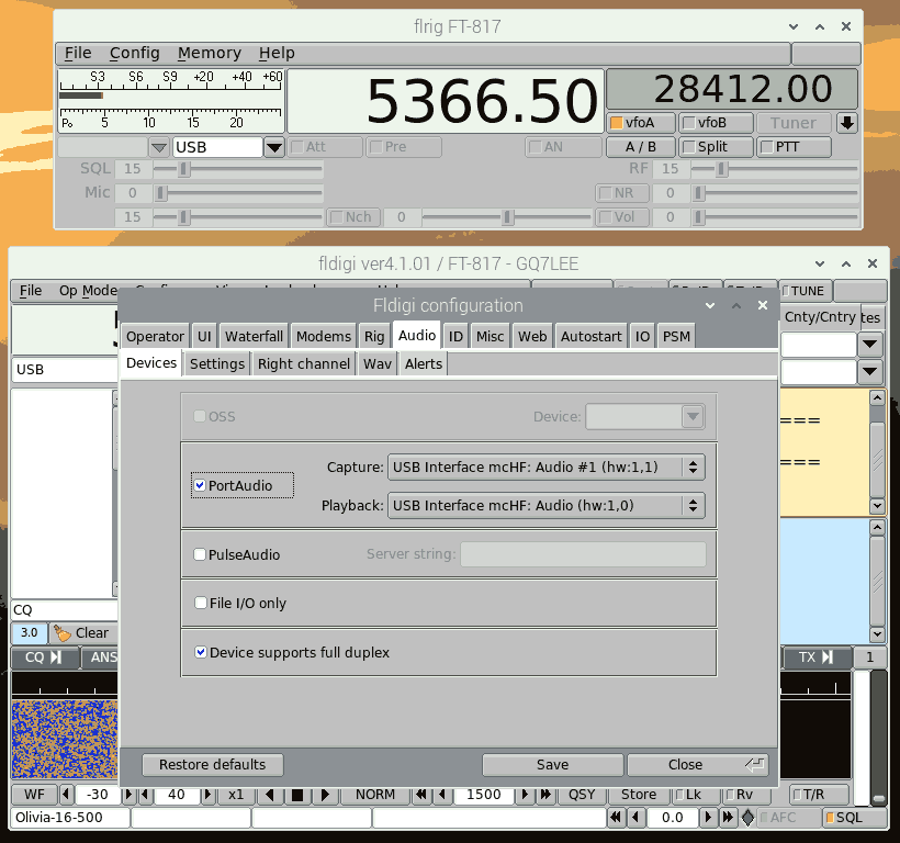 Portaudio worked for me. As I said before, audio on Linux is arcane and flighty. This is not the only way to do this, but portaudio is what worked for me, both with this rig and with the G4ZLP external interface for the FT897. The delightful thing with audio subsystems on Linux is that there are so many different and mutually incompatible standards2 - take your pick…