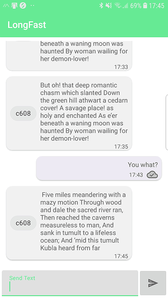 as well as showing the range test packets it does messaging reasonably OK. I determined there’s probably a 255 character limit to the messages, there was only so much Coleridge the app was prepared to relay in one go. You don’t get any pushback if you exceed this, the message just doesn’t happen. 255 characters is more than SMS, so it will be fine in practice, as long as you aren’t copy/pasting long screeds.