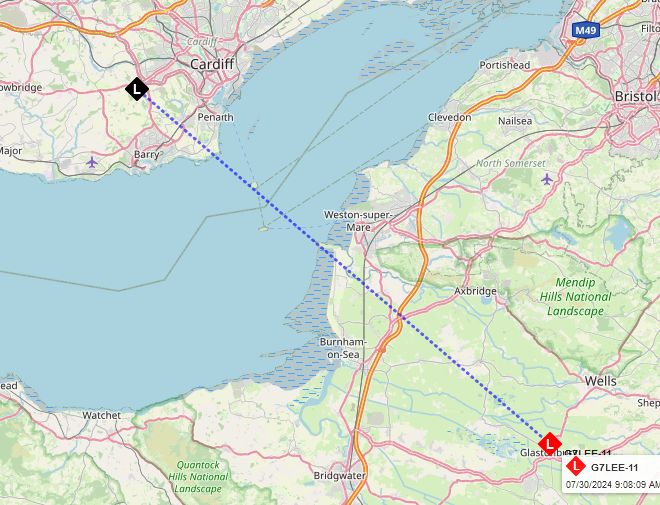 Testing it with a nanoVNA I found I had to move the reflector back quite a bit to raise the antenna impedance (at resonance) for a better match, a SWR about 1.8. In future I’d make it out of copper wire stripped from cooker cable, that way you get to do over if the lengths need fiddling with - a nanoVNA is essential. I have a large hill behind me so I didn’t want to waste RF on that, for most situations a ¼ wave vertical would be fine. 2E0RHM seems to have done a more competent job than I - the element lengths are similar but my gap is more like 4cm than 2cm, I’ve probably given up some of the great Moxon front to back ratio to get SWR down to make up for my imprecise implementation. But the result to GW4WVO-10 is good, and I got a distance of 13 miles to the tracker on a ebay fake Nagoya NA779 in the boot of my car behind the metal part of the hatch, so it’s tolerable for this use, I will use it as is. I don’t expect a lot of LoRa QRM from the hill. 2E0RHM’s construction is the way to go to make these.